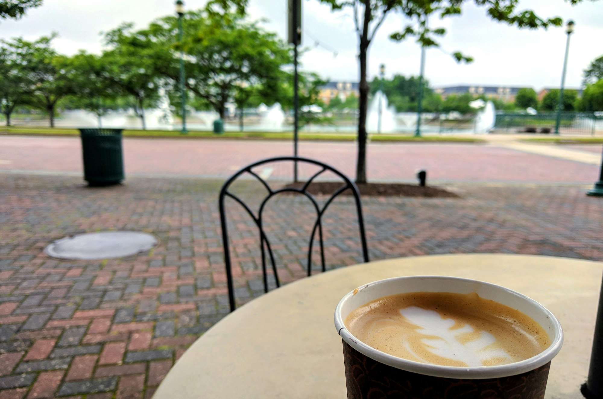 Relaxing outside a coffee shop with a latte while enjoying the view of the fountain